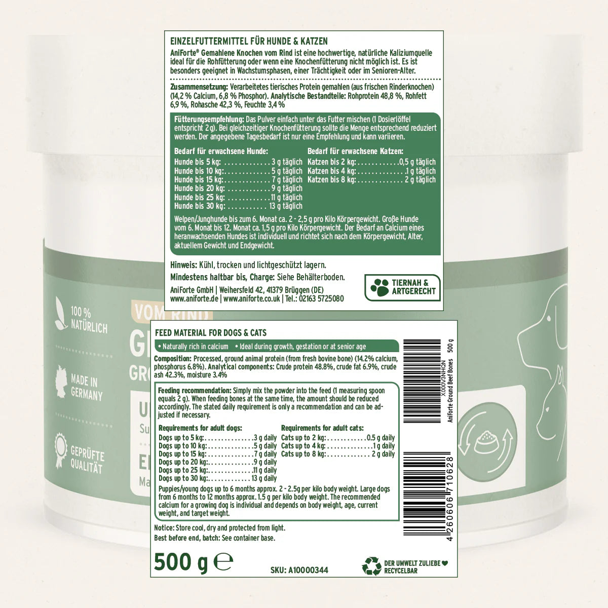 AniForte® Gemahlene Knochen kann dazu beitragen, die natürliche Knochenstruktur Deines Vierbeiners zu unterstützen. Das in den Knochen enthaltene Calcium kann die Gesunderhaltung bewahren und den Knochenabbau verlangsamen.