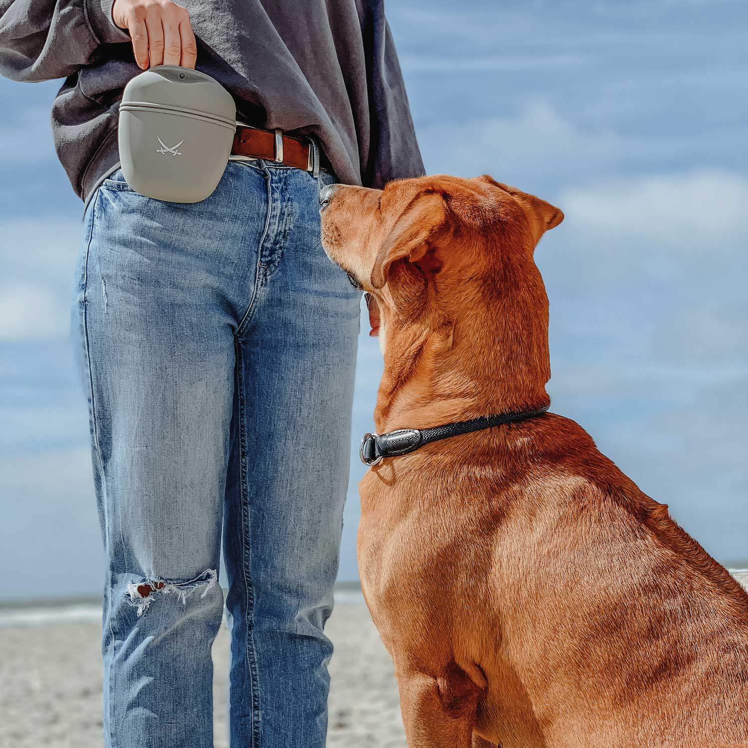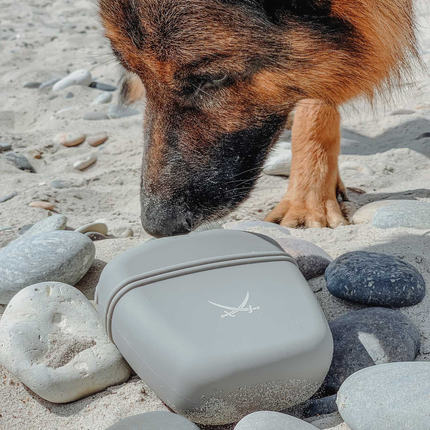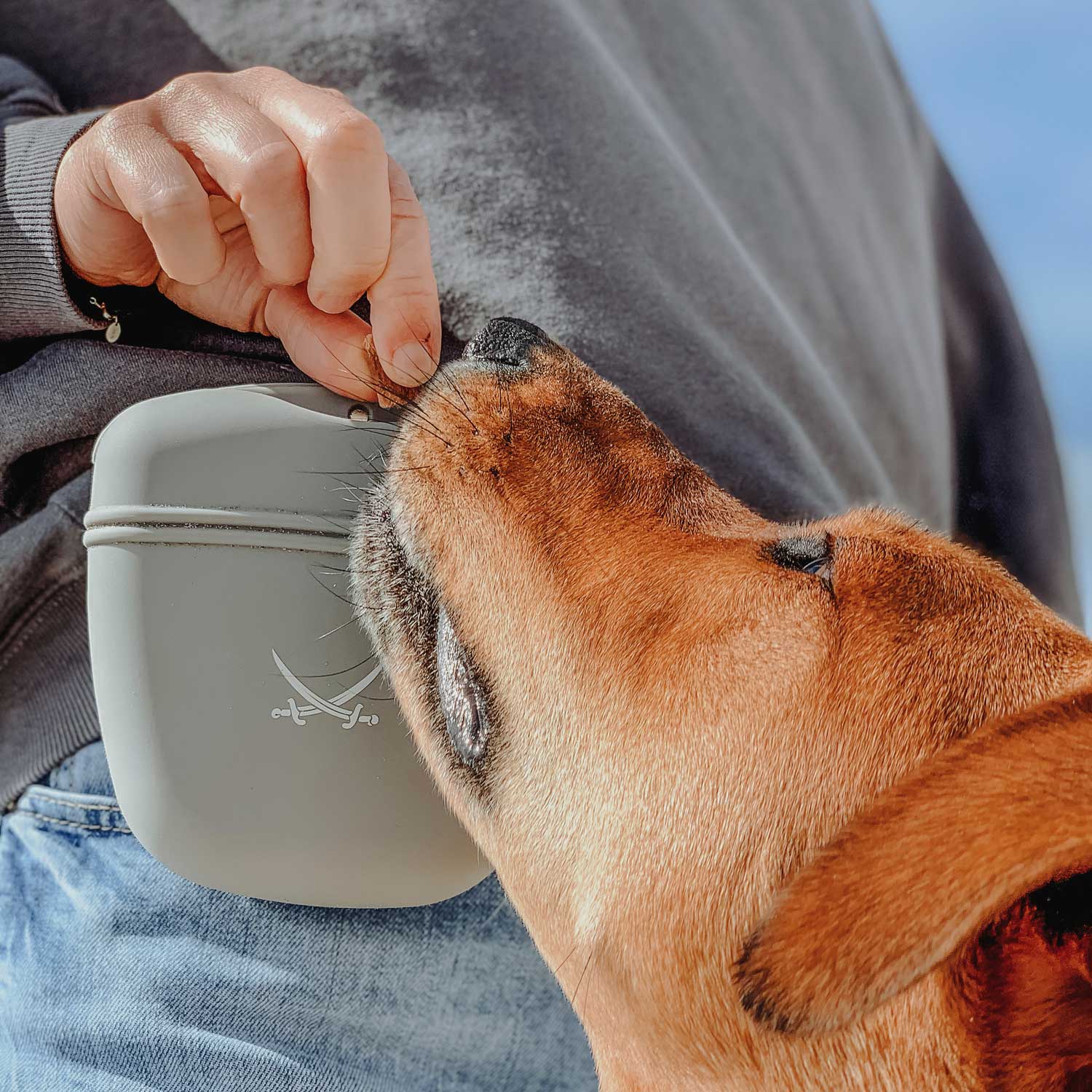 Wenn die Zweibeiner sich im Sylter Kult-Restaurant Sansibar kulinarisch verwöhnen lassen, sollte auch der geliebte Vierbeiner nicht leer ausgehen. Der Snackbeutel MORSUM bietet viel Platz für trockene oder saftige Happen, die als Belohnung für das brave Verweilen am Tisch, das Apportieren eines Gegenstands aus dem Meer oder einfach so gegeben werden können. Durch den Magnetverschluss schnappt das weiche Silikonmaterial des »Snackdepots« nach jedem Griff hinein sofort wieder zu. Eine saubere Sache, denn so kann kein Leckerchen versehentlich herausfallen und auch der Geruch dringt nicht nach außen. Das freut die Tischnachbarn im Restaurant und an jedem anderen stark frequentierten Ort. Dank des praktischen Kunststoff-Clips kann MORSUM ganz nach Belieben am Gürtel oder Hosenbund befestigt werden, sodass der schmackhafte Inhalt jederzeit griffbereit ist. Gefertigt ist das praktische Must-Have für Hundehalter aus lebensmittelgeeignetem Silikon, dass viele Vorteile vereint. Es kann einfach abgewischt oder ausgewaschen werden, nimmt keine Gerüche oder Geschmack an und ist angenehm leicht und weich.